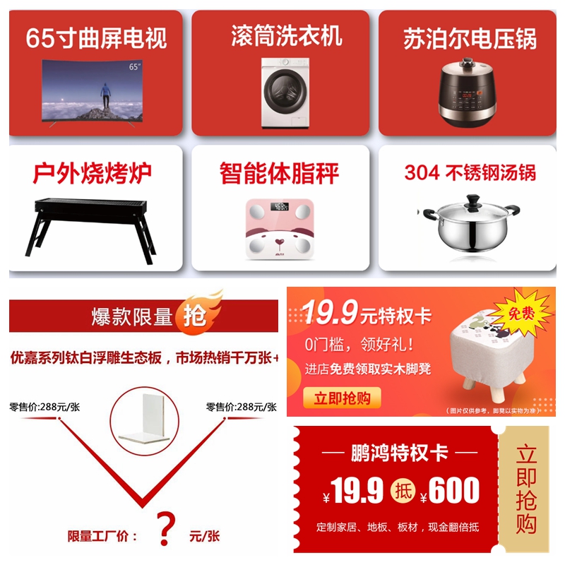 鵬鴻板材、定制家具、木門、地板等產品平均讓利50%,只要支付6.6元認購金,即可鎖定優惠,先到先得。