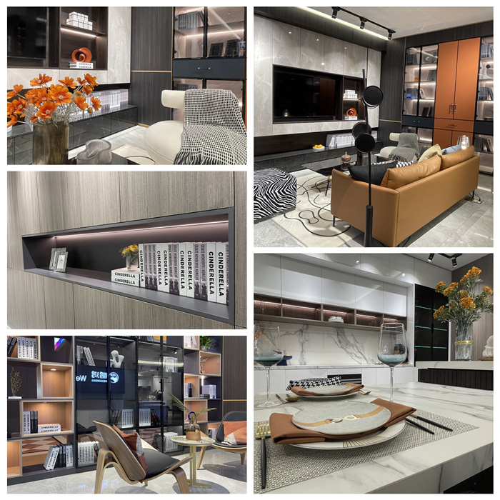 在輕奢的餐廚空間中,金屬踢腳線附以LED燈光帶,在光影映襯下,產品的輪廓、空間的立體感躍然紙上。與此同時,盛夏林蔭、春香玉色等板材花色的應用,讓產品的輕奢氣質不言自明。