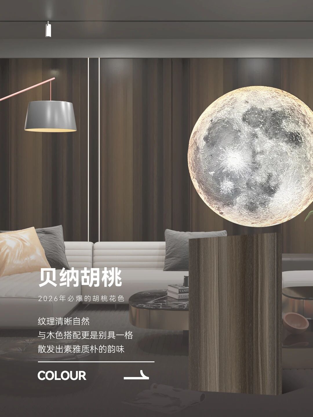 貝納胡桃。紋理清晰自然,與木色搭配更是別具一格,散發出素雅質樸的韻味,目之所及皆美好 從輕奢到極簡,從東方禪意到復古風情